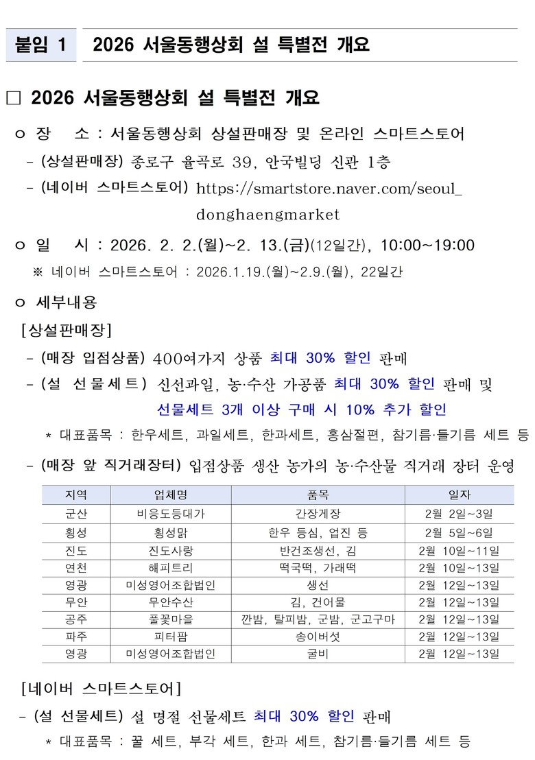 - 농특산물, 설 선물세트를 최대 30% 할인된 가격으로 서울동행상회 온·오프라인에서 판매