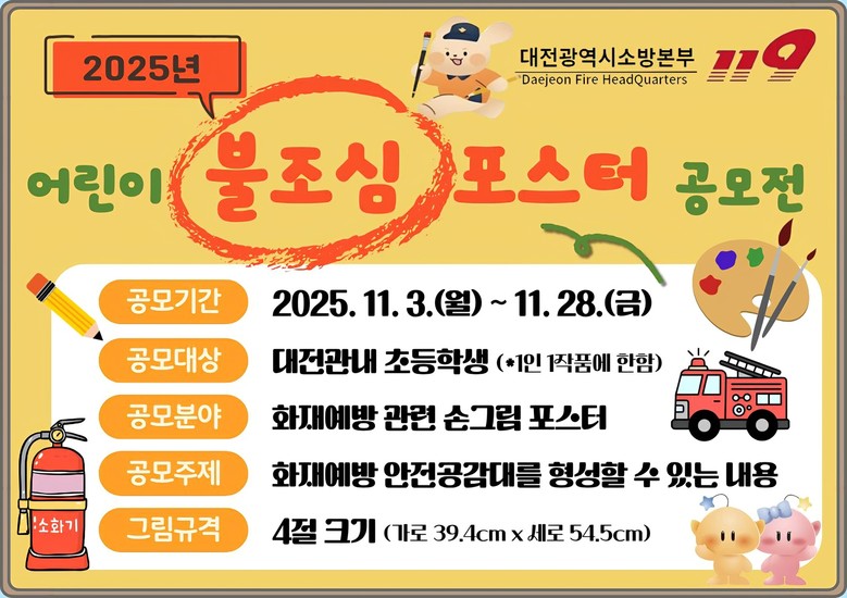 참가 대상은 대전 지역 초등학생 누구나이며, ‘화재 예방의 필요성과 안전의 중요성’을 주제로 한 포스터를 자유롭게 그리면 된다.