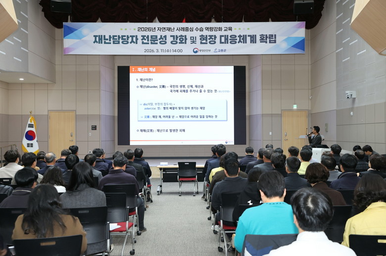 [고흥군 세계타임즈=우덕현 기자] 고흥군(군수 공영민)은 지난 11일 군청 우주홀에서 대규모 자연재난 발생에 대비해 지방정부의 수습 역량을 강화하고 현장 중심 대응체계를 확립하기 위해 ‘2026년 자연재난 사례 중심 수습 역량강화 교육’을 실시했다고 밝혔다.