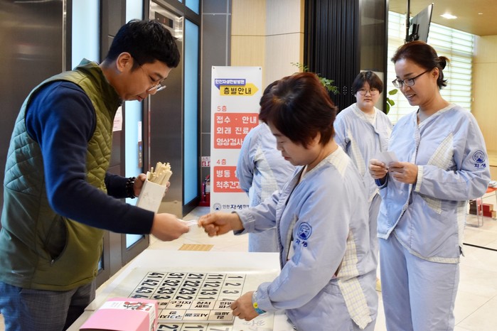| ▲인천자생한방병원 환자들이 설 맞이 행사에 참가해 뽑기를 하고 있다. |