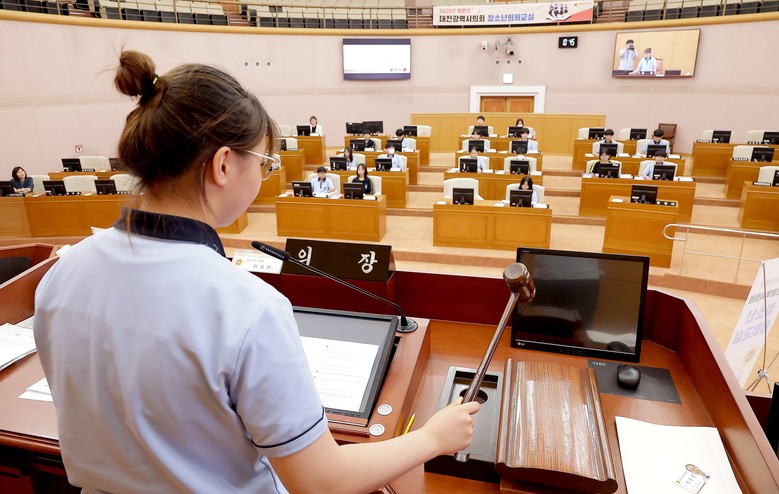 일일 시의원이 된 진잠중 학생들은 모의 본회의에 참여해 ‘일회용품 사용 제한’에 대한 건의안을 상정하고 열띤 찬반 토론을 통해 다양한 의견을 나누면서 실현 가능한 대안을 함께 모색했다.