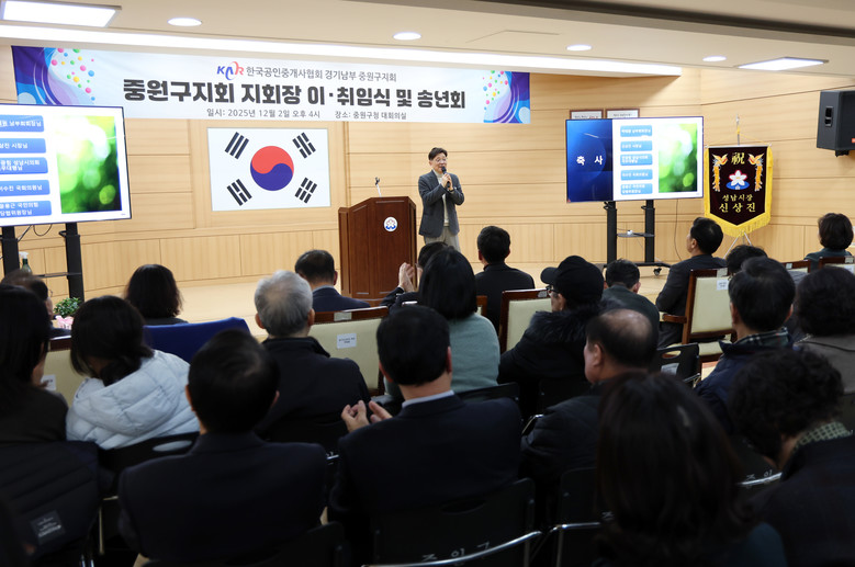 [성남시 세계타임즈=송민수 기자] 성남시의회(부의장 안광림을 비롯한 의원들)는 2일 중원구청 대회의실에서 열린‘한국공인중개사협회 중원구지회 송년회’에 참석했다. 이날 행사는 한 해의 활동을 정리하고 새로운 출발을 다짐하는 자리로, 개회 선언과 국민의례를 시작으로 내외빈 소개, 지회장 이·취임식, 표창장 수여 등이 차례로 진행됐다.