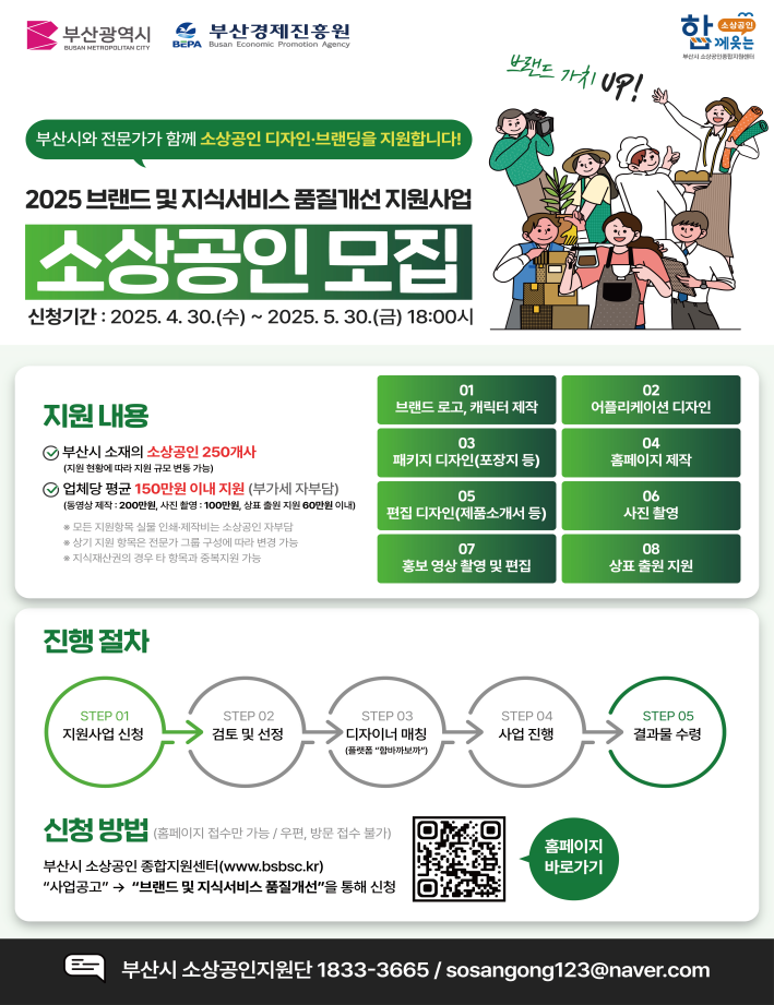 ◈ 오늘(30일)부터 「2025년 소상공인 브랜드 및 지식서비스 품질개선 지원사업」 지원업체 및 디자인 전문가 모집 [부산 세계타임즈=이용우 기자] 부산시(시장 박형준)와 (재)부산경제진흥원(원장 송복철)은 지역 소상공인을 대상으로 「2025년 소상공인 브랜드 및 지식서비스 품질개선 지원사업」을 통한 브랜드 품질과 경쟁력 높이기에 나선다고 밝혔다.