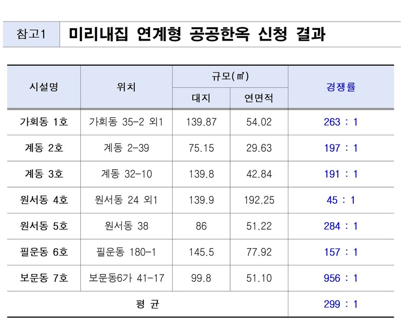 모집 결과, 가장 인기를 끈 곳은 ▴보문동 7호(보문동6가 41-17)로 956대 1을 기록했고, ▴원서동 5호(원서동 38)가 284 대 1, ▴가회동 1호(가회동 35-2)가 263 대 1로 그 뒤를 이었다.