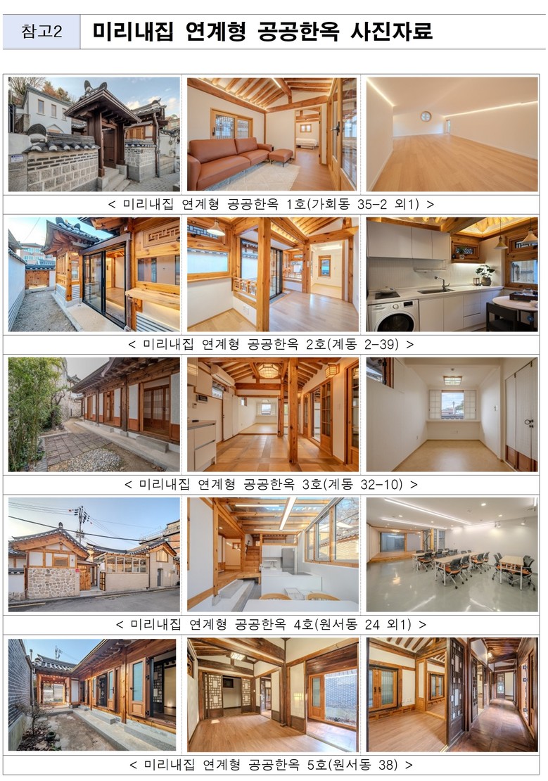 이번에 공급된 한옥들은 중심업무지구와 인접한 종로, 성북에 위치하여, 원룸형부터 방 4개에 가족실 등을 갖춘 대형 한옥에 이르기까지 위치·규모·구조 등을 달리해 입주희망자의 생활양식, 취향에 따라 다양한 선택이 가능한 것이 특징이다.