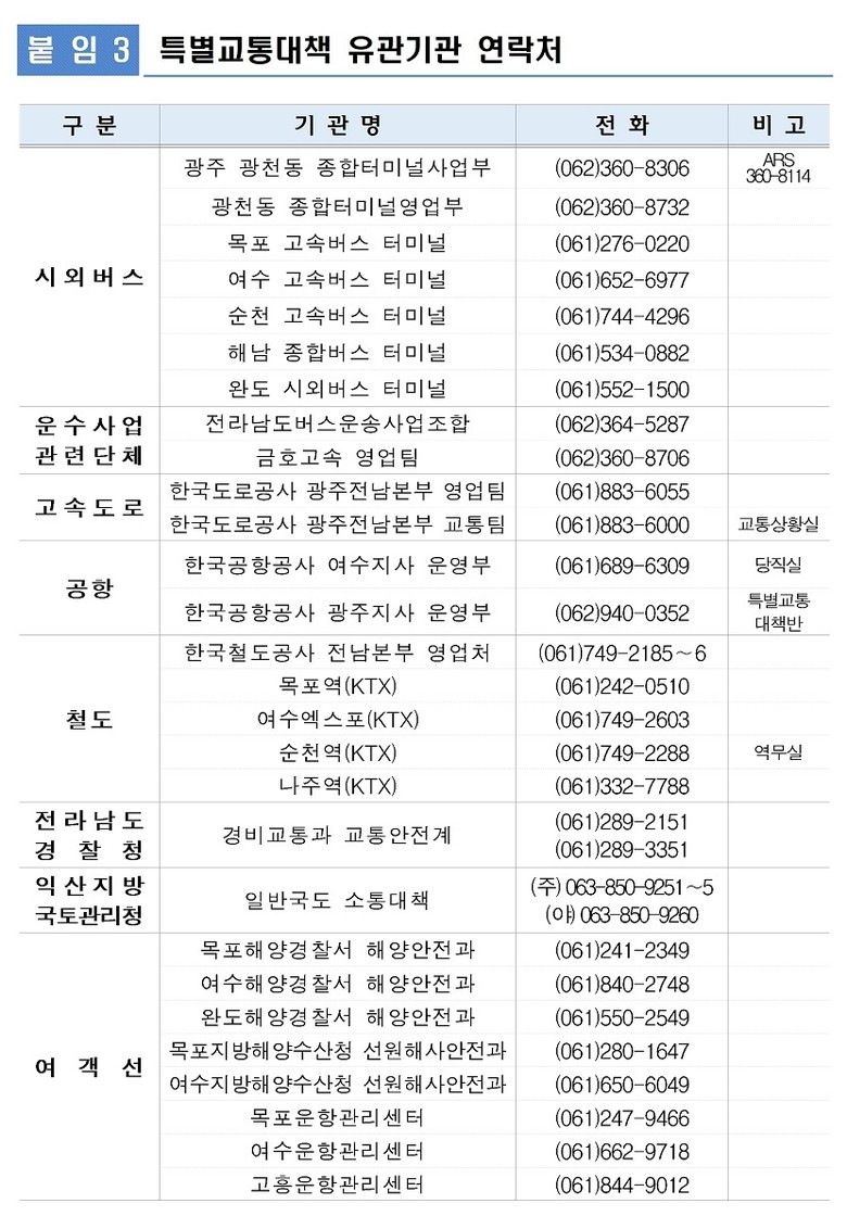 강종철 전남도 자치행정국장은 “연휴 기간 종합상황실과 분야별 대책반 운영을 통해 도와 22개 시군, 유관기관이 긴밀히 협력해 각종 재난과 안전사고에 신속히 대응, 도민과 귀성객이 안심하고 가족과 함께하는 설 명절을 보내도록 하겠다”고 말했다.