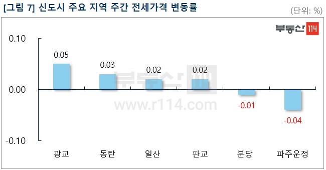 신도시는 △광교(0.05%) △동탄(0.03%) △일산(0.02%) △판교(0.02%)가 올랐고 ▼파주운정(-0.04%) ▼분당(-0.01%)이 떨어졌다. 광교는 수원시 하동 광교레이크파크한양수자인 1,000만원 정도 올랐고 동탄은 영천동 동탄반도유보라아이비파크2차가 1,000만원 상승했다. 일산은 백석동 흰돌6단지라이프빌라, 마두동 강촌7단지선경코오롱, 주엽동 문촌8단지동아 등이 250만원-1,000만원 올랐다.