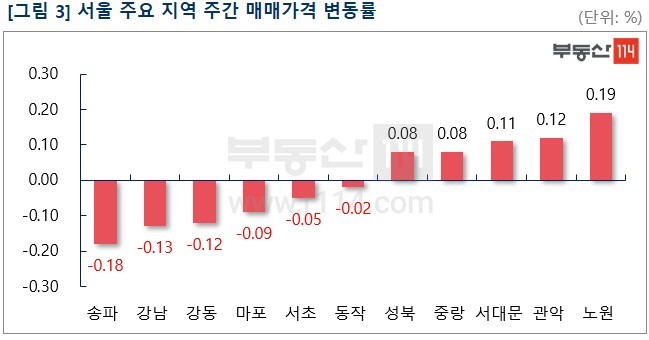 부동산114(www.r114.com)에 따르면 연휴로 인해 2주간의 시세 조사분이 반영됐음에도 불구하고 서울 아파트 매매가격 변동률은 2주전 보다 하락폭(-0.07%)이 줄어든 -0.04%를 기록했다. 재건축 아파트와 일반 아파트가 각각 0.13%, 0.02% 떨어졌다. 이밖에 경기ㆍ인천이 0.05% 올랐고 신도시는 보합세(0.00%)를 나타냈다.