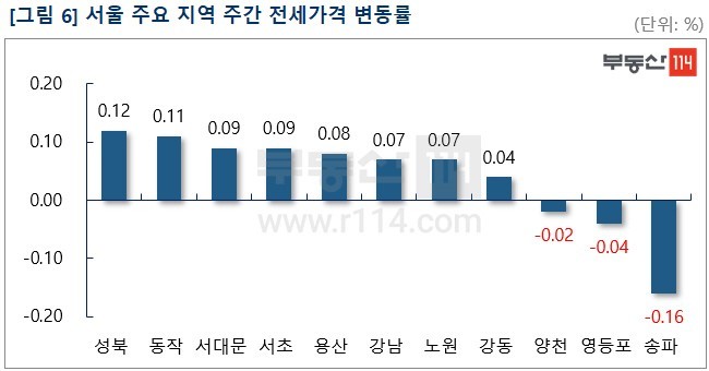 서울 전세시장은 △성북(0.12%) △동작(0.11%) △서대문(0.09%) △서초(0.09%) △용산(0.08%) △강남(0.07%) △노원(0.07%) 등이 올랐다. 성북은 종암동 종암2차SK뷰, 정릉동 길음뉴타운10단지(라온유), 길음동 길음뉴타운8단지(래미안) 등이 1,000만원-2,000만원 상승했다. 동작은 상도동 e편한세상상도노빌리티와 흑석동 흑석한강센트레빌 등이 500만원-2,500만원 올랐다. 서대문은 북가좌동 DMC한양과 북가좌삼호, 남가좌동 쌍용스윗닷홈 등이 500만원-1,500만원 상승했다. 반면 전세 수요가 크게 감소한 ▼송파(-0.16%) ▼영등포(-0.04%) ▼양천(-0.02%)은 하락했다.