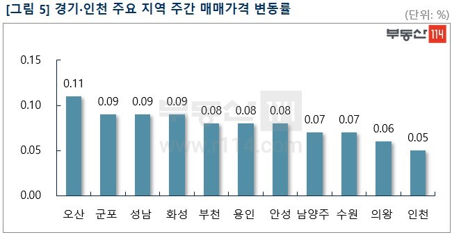 경기ㆍ인천은 경기 남부권 중심으로 올랐다. 수용성(수원ㆍ용인ㆍ성남)이 여전히 상승을 주도하고 있지만 상승폭은 꾸준히 둔화되는 모습이다. 지역별로는 △오산(0.11%) △군포(0.09%) △성남(0.09%) △화성(0.09%) △부천(0.08%) △용인(0.08%) △안성(0.08%), △남양주(0.07%) △수원(0.07%) 등이 올랐다. 오산은 부산동 오산시티자이1단지와 양산동 효성백년家약이 750만원-1,000만원 상승했다. 군포는 대야미동 대야미IPARK와 산본동 래미안하이어스가 500만원-1,000만원 올랐다. 성남은 하대원동 태연스카이빌, 금광동 황송마을이 1,000만원 정도 상승했다.