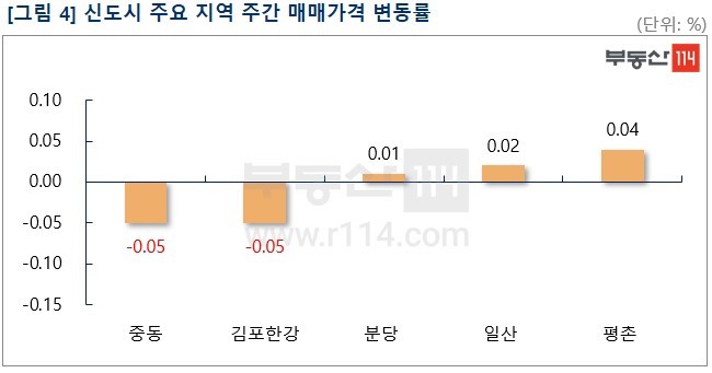 신도시는 ▼중동(-0.05%) ▼김포한강(-0.05%)이 하락했다. 중동과 김포한강은 대단지 중심으로 내렸다. 중동은 중동 한라주공3단지가 1,000만원 정도 하락했고 김포한강은 구래동 김포한강IPARK가 600만원 가량 떨어졌다. 반면 △평촌(0.04%) △일산(0.02%) △분당(0.01%)은 소폭 상승했다. 이외 신도시는 변동 없이 보합세(0.00%)을 보였다.