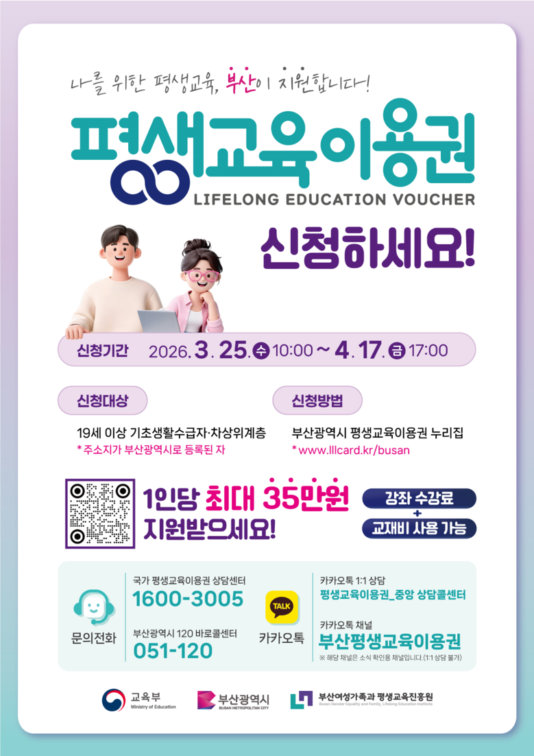 ◈ 저소득층, 시 평생교육이용권 누리집 ▲장애인, 보조금24 누리집을 통해 신청하면 돼, 노인·디지털·지역특화 유형은 6월경 별도 공고 예정 [부산 세계타임즈=이용우 기자] 부산시(시장 박형준)는 오는 3월 25일부터 소외계층 성인(저소득층 및 장애인 등)을 대상으로 '2026년 부산광역시 평생교육이용권' 신청.접수를 시작한다고 밝혔다.