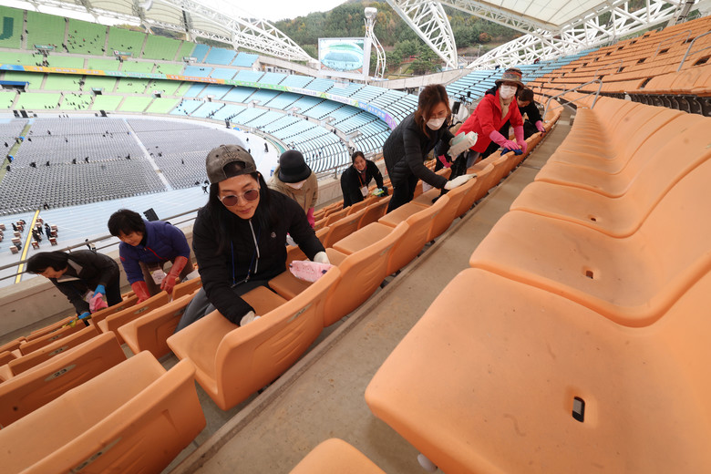 | ▲ 11일 대구스타디움에서 ‘신천지 12지파 시온기독교선교센터 114기 수료식’이 준비되는 가운데 봉사자들이 좌석을 청소하고 있다 |