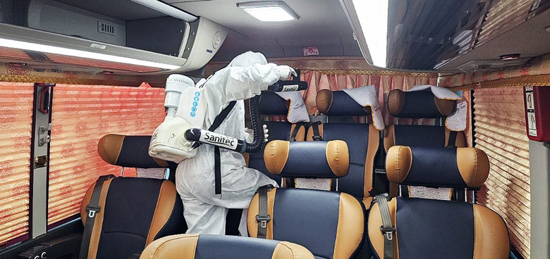 | ▲ 11일 대구스타디움에서 ‘신천지 12지파 시온기독교선교센터 114기 수료식’이 개최되는 가운데 봉사자들이 수료생들이 탑승할 전세버스를 소독하고 있다 |