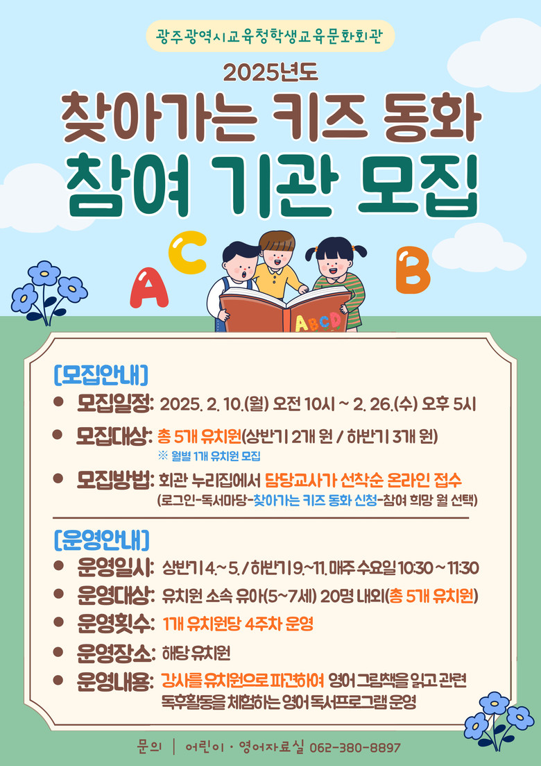 광주학생교육문화회관 정은남 관장은 “이번 프로그램을 통해 유아들이 자연스럽게 책과 도서관을 접하고, 영어에 대한 흥미와 자신감을 갖게 되길 바란다”며 “앞으로도 지역사회와 연계한 독서 문화 풍토가 조성되도록 최선을 다하겠다”고 말했다.