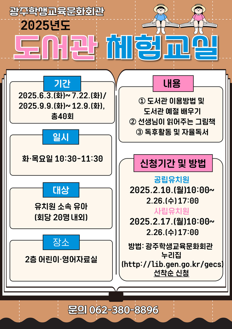 수강료는 무료이며, 참여를 희망하는 유치원은 오는 10일 오전 10시부터 26일 오후 5시까지 광주학생교육문화회관 누리집을 통해 신청하면 된다. 자세한 내용은 광주학생교육문화회관 누리집(https://lib.gen.go.kr/gecs/) 독서마당 게시판 또는 ‘도서관 체험교실’(062-380-8896)·‘찾아가는 키즈 동화’(062-380-8897)에서 확인할 수 있다.