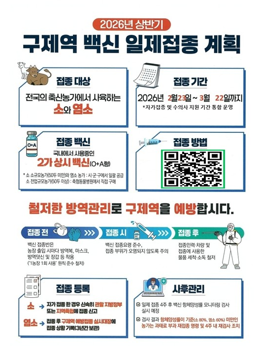 이번 일제접종은 2월 23일부터 3월 22일까지 4주간 도내 소·염소 사육 농가를 대상으로 집중 실시된다. 접종 대상은 소 8,826농가 32만 6천 마리, 염소 2,881농가 6만 9천 마리로, 총 1만 1천여 농가가 포함된다.