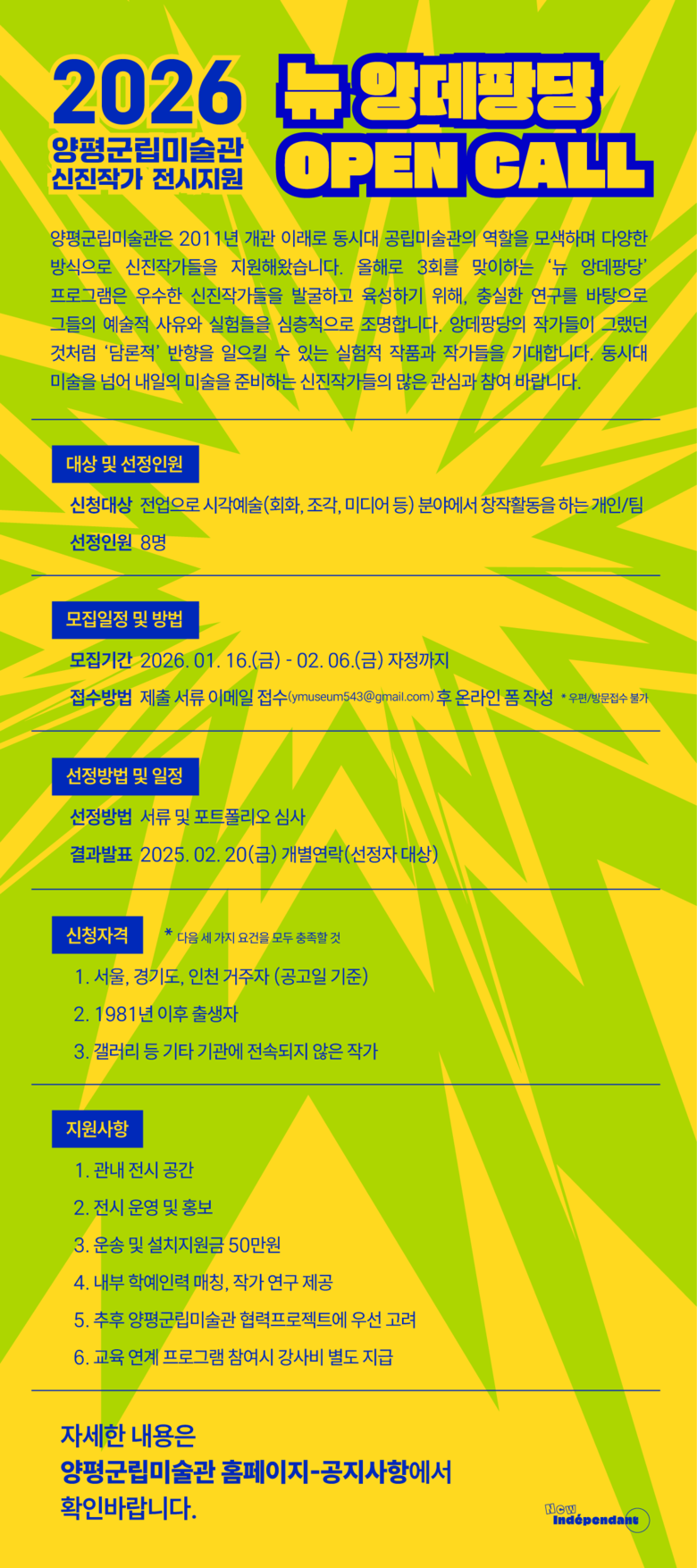공모 접수는 1월 16일부터 2월 6일까지 3주간 진행되며, 자세한 내용은 양평군립미술관 누리집에서 확인할 수 있다.