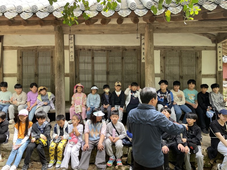 | ▲ 지난해. 본량초 학생들이 마을 용진산 및 용진정사를 들러 교장선생님께 본량마을 의병활동에 대한 설명을 듣고 있다 |