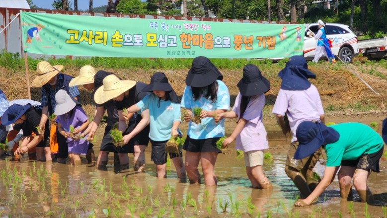 | ▲ 지난해 본량초 학생들이 본량마을 지역사회 공동체 협조를 얻어 학교 옆 논에서 손모심기 체험을 하고 있다 |