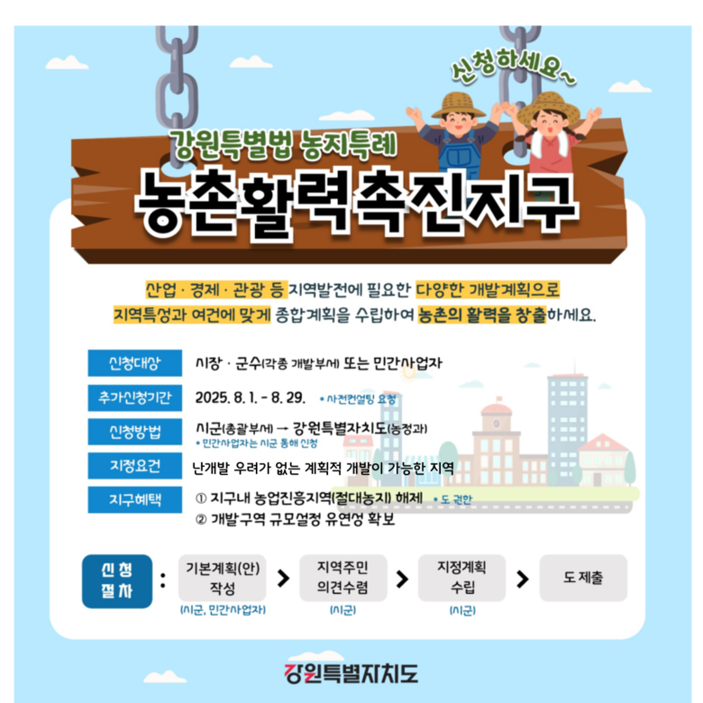 강원특별자치도는 개정된 조례 기준을 적용한 ‘농촌활력촉진지구 관리 지침’을 시군에 통보하고, 오는 8월 1일부터 29일까지 2차 촉진지구 추가신청 접수를 받는다.