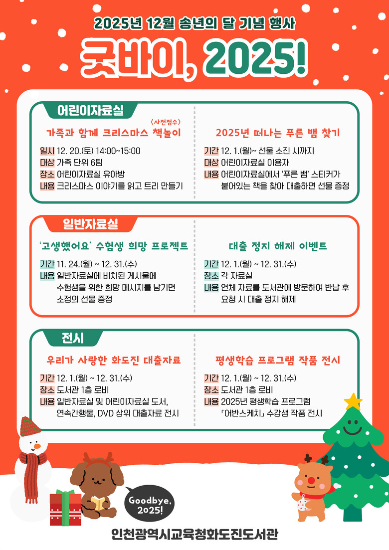 이번 행사는 ▲가족과 함께 크리스마스 책놀이 ▲수험생 희망 메시지 남기기 ▲ ‘2025년 떠나는 푸른 뱀 찾기’ 등 시민 참여 중심의 프로그램으로 구성해 따뜻한 연말 분위기를 조성한다.