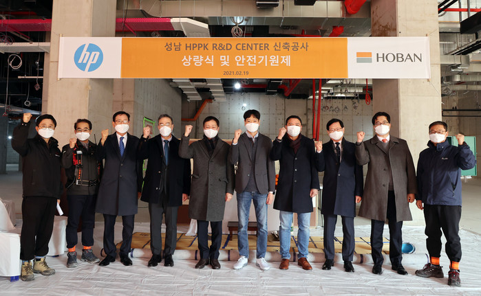 호반건설은 19일 성남시 수정구 고등지구에서 HP 프린팅 코리아 R&D센터의 상량식을 개최했다. 상량식은 건물의 골조 완성을 알리는 것으로 이날 무재해를 염원하는 안전기원제와 함께 진행했다. 이날 행사는 코로나19 확산 방지를 위해 김광석 HP 프린팅 코리아 대표, 김명열 호반건설 건설부문 대표 등 일부 인원만 참석했다.