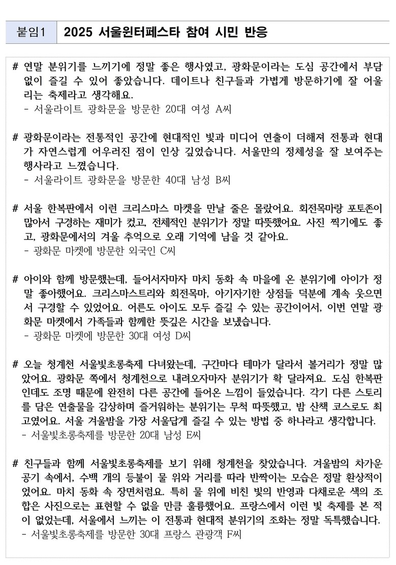 김태희 서울시 문화본부장은 “영하로 떨어지는 한파에도 1천만 명 넘는 방문객이 찾아 준 <2025 서울윈터페스타>를 통해 서울에서 열리는 겨울 축제의 잠재력을 확인하는 기회였다”며 “이번 성과를 발판 삼아 ‘서울윈터페스타’에 참여하기 위해 국내외 관광객들이 서울을 찾게 만드는 대한민국 대표하는 글로벌 겨울 축제로 더 발전시켜 나가겠다”라고 말했다.