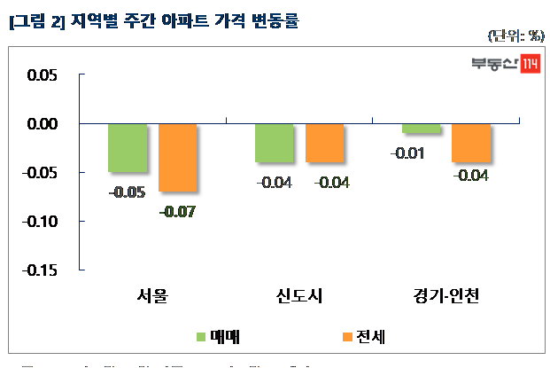 부동산114(www.r114.com)에 따르면 금주 서울 아파트값은 0.05% 떨어져 23주 연속 하락했다. 일반아파트가 0.08% 떨어져 한 주전(0.04%) 대비 히락폭이 2배 확대됐다. 재건축은 급급매 소진으로 매물이 줄어들며 0.14% 상승했다. 재건축과 일반아파트가 상반된 움직임을 보이고 있지만, 일반아파트의 약세 분위기가 시장 전반에 더 큰 영향력을 발휘하고 있다. 신도시와 경기ㆍ인천의 매매가격은 각각 -0.04%, -0.01%의 변동률을 기록했다.