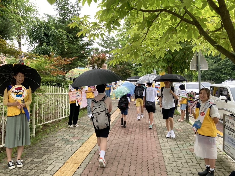 ◦ ‘따돌림, 괴롭힘 학교폭력 NO!’, ‘학교폭력 예방, 입장 바꿔 생각해요’ 등의 피켓을 들고 등교하는 학생들 맞이