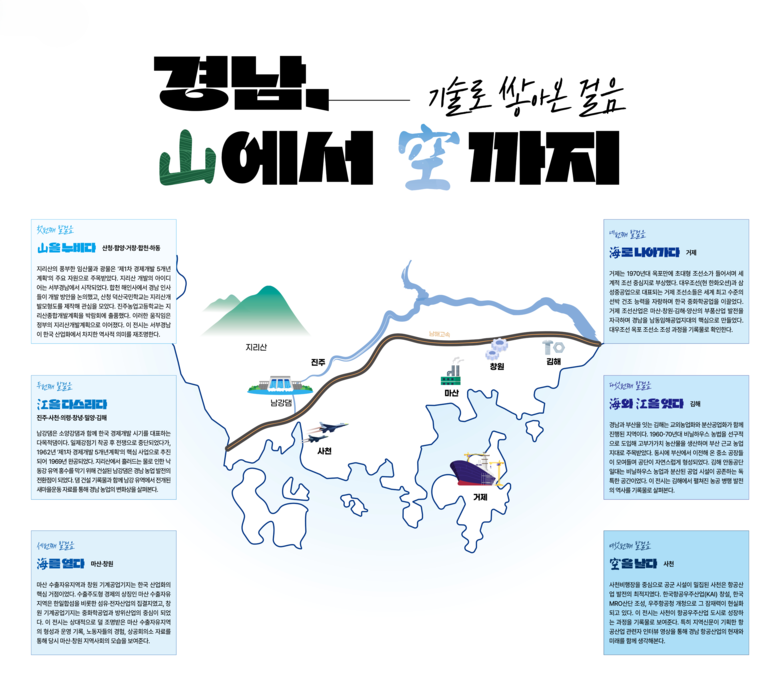 - 山(지리산 개발), 江(남강댐), 海(조선), 空(우주항공)을 주제로 경남 산업화의 역사적 흐름 및 미래 비전 제시
