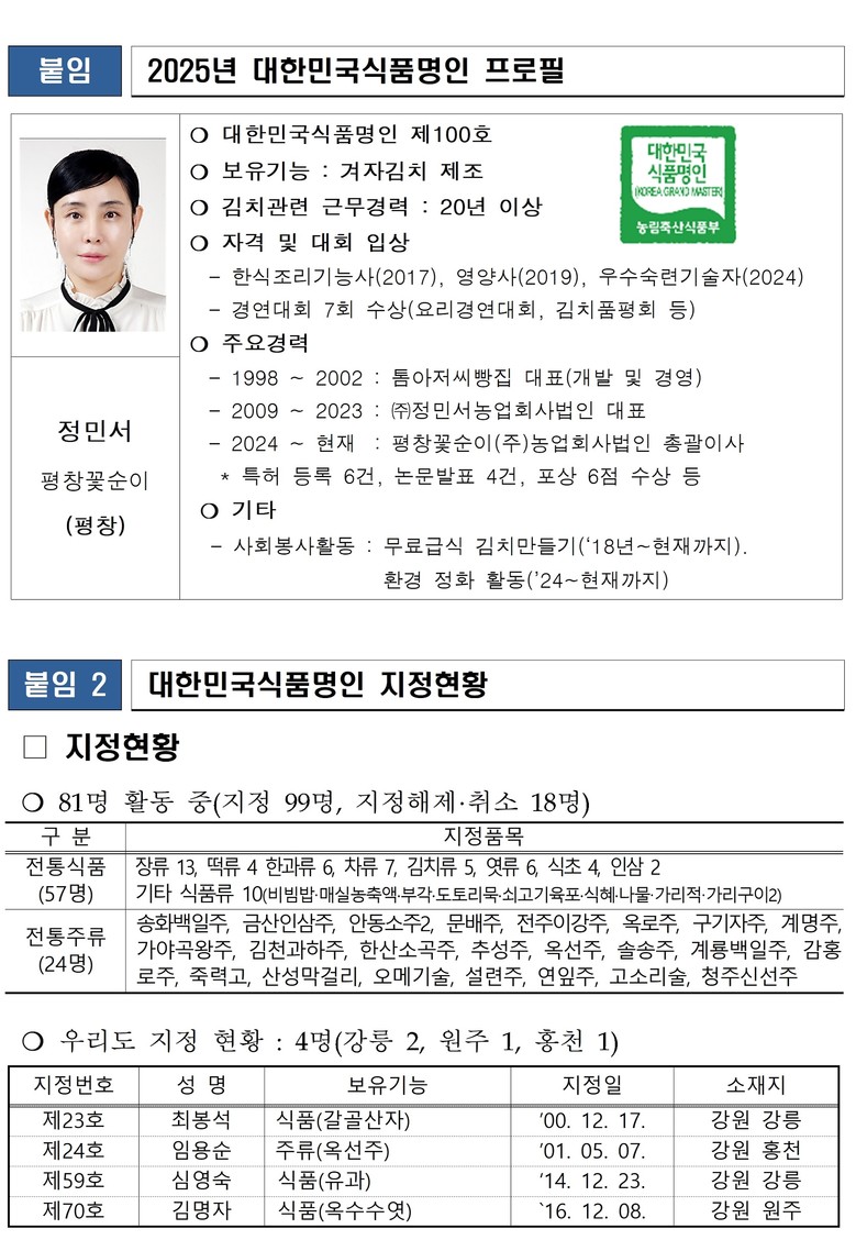 대한민국 식품명인 제도는 우수한 우리식품의 계승‧발전을 위하여 식품제조‧가공‧조리 분야에서 우수한 식품기능인을 대한민국식품명인으로 지정하는 제도로, 1994년부터 현재까지 81명의 명인이 지정(김치류 5명) 및 활동 중이며, 강원자치도에서는 현재 2016년 이후 9년 만에 신규 지정이다.