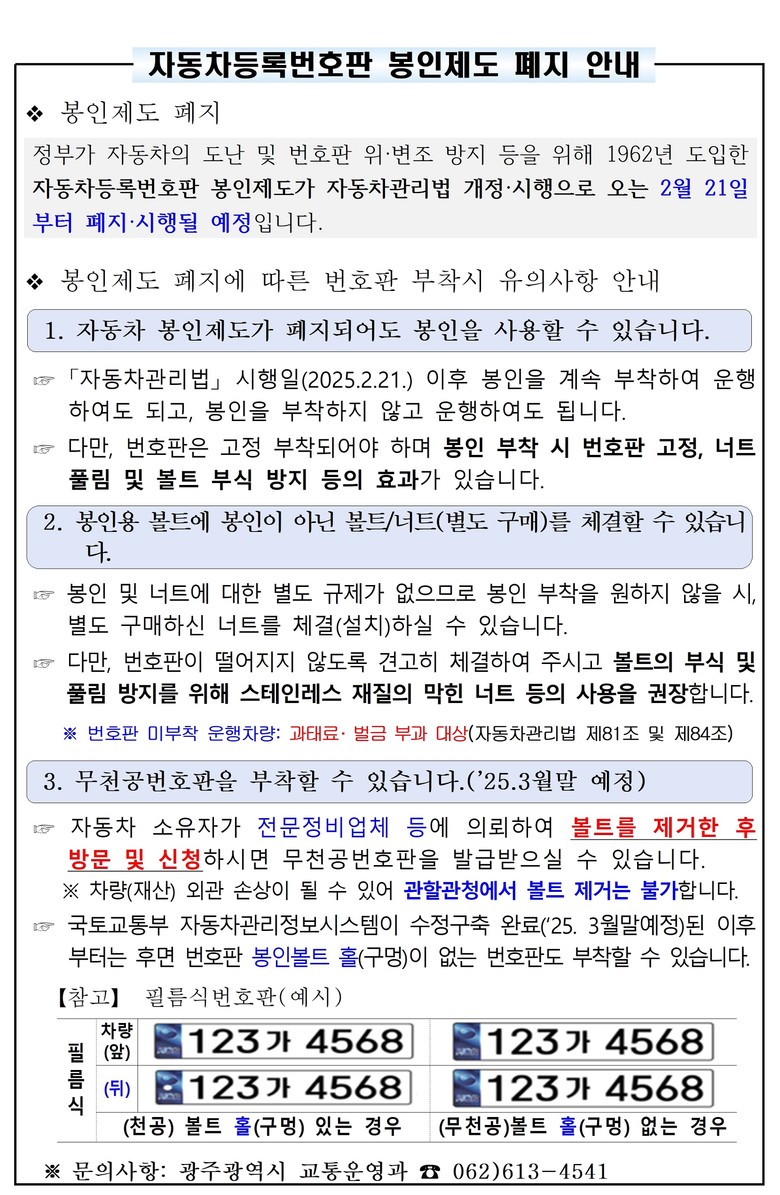 정준호 교통운영과장은 “봉인제도 폐지에 따라 자동차 등록사무 간소화를 통해 시민생활의 불편이 크게 감소하게 됐다”며 “보다 자세한 사항은 광주시 교통운영과로 연락하면 상세히 안내받을 수 있다”고 말했다.
