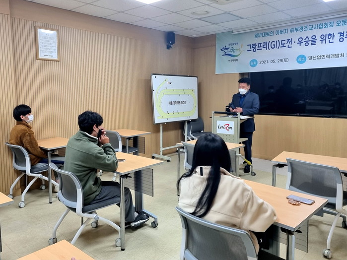 [세계타임즈 심귀영 기자]한국마사회(회장 김우남) 경마아카데미에서는 지난 29일(토) 오문식 前 조교사를 초청해 기수후보생들에게 특강을 실시했다. 오문식 前 조교사는 현역시절 대상경주를 무려 14번 우승했으며, 최고 경주인 ‘그랑프리’ 우승의 영광까지 안았던 부경 대표 조교사다.