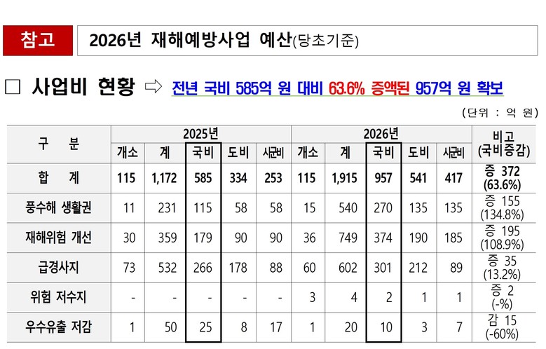 특히, 태풍·집중호우 등 자연재난으로부터 도민의 생명과 재산을 보호하기 위해 2026년도 재해예방사업 국비 957억 원(지방비 포함 총 1,915억 원)을 확보했다.