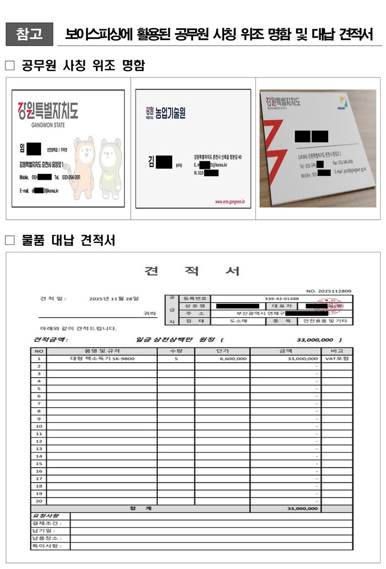 윤우영 강원특별자치도 행정국장은 “도 공무원이 개인 전화로 금품·물품 대납을 요구하는 일은 절대 없다”며, “유사한 연락을 받을 경우 즉시 전화를 끊고 도청 담당 부서에 사실 여부를 확인해 달라”고 당부했다. 이어 “사칭 피해가 확산되지 않도록 사례를 시군에 공유하고, 유관기관 및 사회단체와 협력해 예방 활동을 더욱 강화하겠다”고 밝혔다.