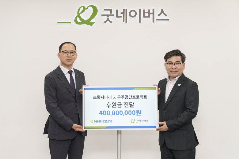 [세계타임즈 = 이송원 기자] NH농협은행(은행장 이석용)은 지난 22일 굿네이버스 회관(서울시 영등포구 소재)에서 글로벌 아동권리 전문 NGO 굿네이버스와 「초록사다리 × 우주공간프로젝트」 사업 실시를 위해 4억원을 기탁하고 업무협약(MOU)을 체결했다고 23일 밝혔다.