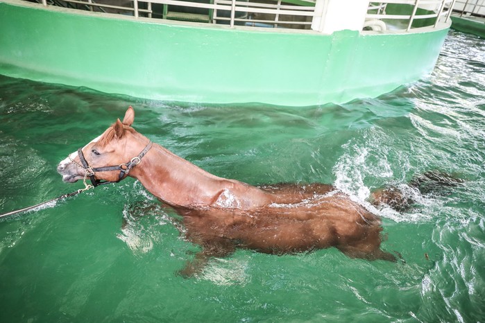 [세계타임즈 김인수 기자] 지난 3월 18일 서울 한국마사회(회장 김낙순) 과천경마공원에 경주마 수영장이 개장했다. 개장 첫날부터 경주마들이 거친 숨을 내쉬며 줄줄이 수면을 가리는 이색 풍경이 펼쳐졌다. 경주마들을 위한 전용 수영장이 국내에 3개소나 있다는 사실을 아는 사람은 많지 않다. 하지만 말 수영은 오랜 역사를 지닌 말 훈련법이며 현재는 경마를 시행하는 대부분의 국가에서 시행할 정도로 그 효과가 상당하다 인정받고 있다.
