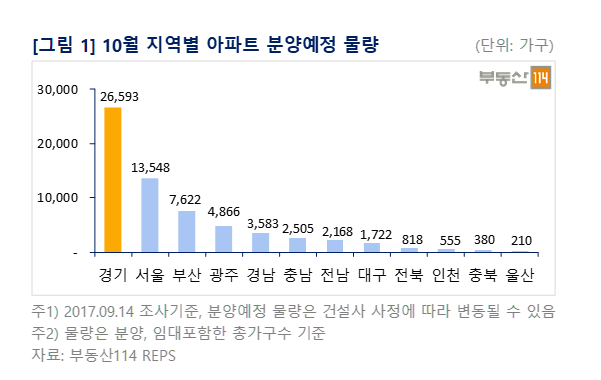 ”, 수영구 광안동 “광안자이” 등 총 7,622가구가 공급될 예정이다. 9.5추가대책에서 집중모니터링지역으로 지정된 부산 6개 구/1개 군(해운대, 연제, 수영, 동래, 남, 부산진, 기장)은 추후 지속적인 가격 상승세를 보일 경우 투기과열지구로 지정될 가능성이 있다. 해당지역에서 분양을 앞둔 아파트의 수요자는 정부의 추가 규제 가능성을 열어 놓고 신중한 청약전략이 필요하다. 이 외 ▲광주 4,866가구 ▲경남 3,583가구 ▲충남 2,505가구 ▲전남 2,168가구 ▲대구 1,722가구 ▲전북 818가구 ▲충북 380가구 ▲울산 210가구 순이다.