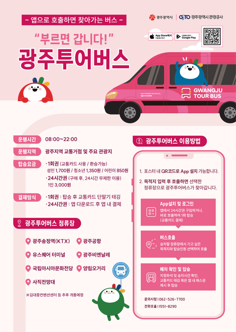 광주투어버스 앱은 애플 앱스토어와 구글 플레이스토어에서 다운로드할 수 있다. 자세한 내용은 광주문화관광 오매광주 누리집(tour.gwangju.go.kr)과 광주관광공사 대표 누리집(www.gjto.or.kr)에서 확인할 수 있다.