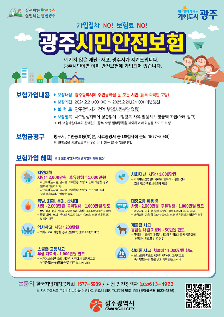 보장기간은 올해 2월 21일부터 내년 2월 20일까지이며, 피해가 발생하면 3년 안에 피해자나 사망자의 유가족이 보험사에 직접 보험금을 신청하고, 청구 방법과 보장 내용 등은 한국지방재정공제회(1577-5939) 또는 시청 안전정책관(613-4923)으로 문의하면 된다.