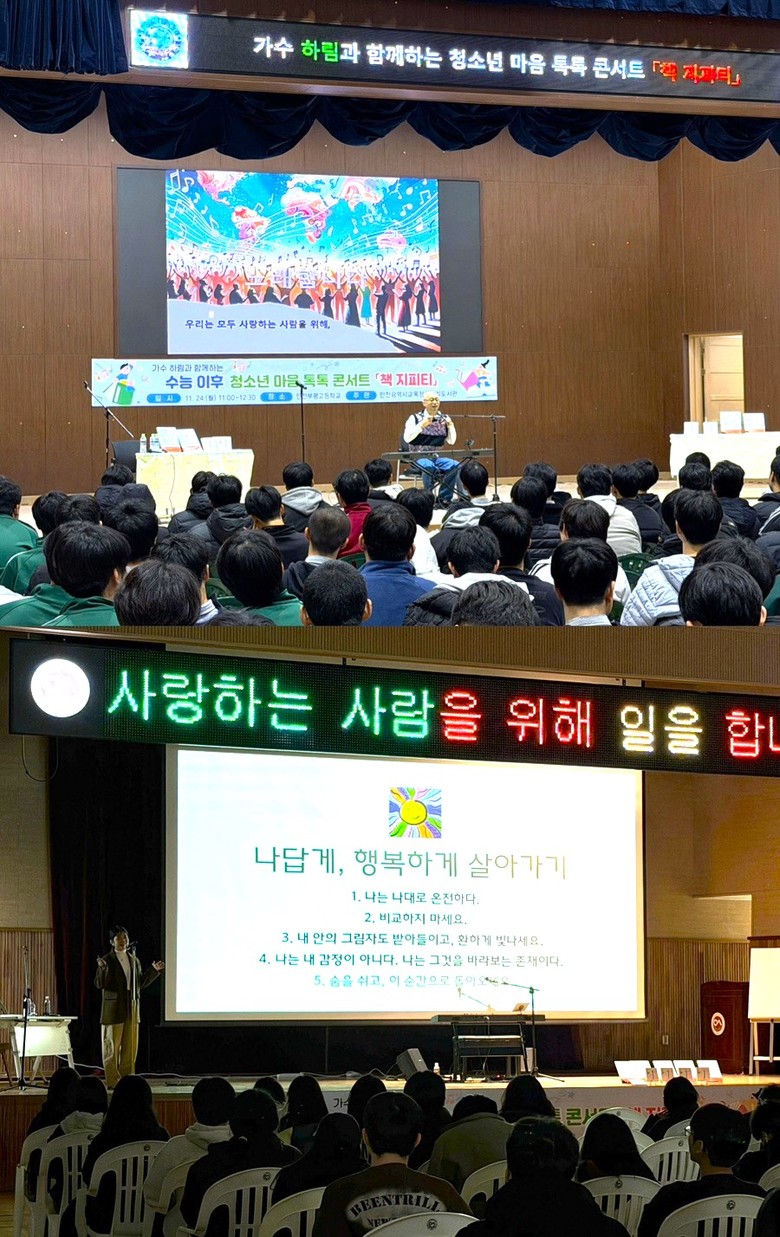 하림은 피아노 연주와 함께 노래를 선보이며 응원의 메시지를 전했으며, 허다솜 작가는 인도에서의 경험과 ‘자기 자신을 사랑하는 법’을 주제로 강연을 진행하며 퀴즈와 대화 프로그램을 운영해 학생들의 참여를 이끌었다.