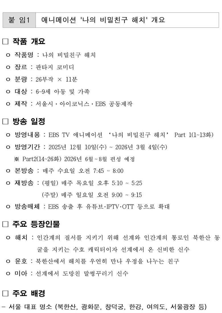 - 본방송 시작하는 12월 기점으로 본격 상품화 및 라이선스 사업 확대 [서울 세계타임즈=이장성 기자] 서울의 대표 캐릭터 해치를 주인공으로 한 3D 애니메이션 <나의 비밀친구 해치>가 12월부터 EBS를 통해 정규 방송을 시작한다. Part 1(1~13화)은 12월 10일(수)부터 2026년 3월 4일(수)까지 매주 수요일 오전 7시 45분부터 8시까지 방영되며, 매주 목요일 오후 5시 10분과 일요일 오전 9시에 재방송된다.
