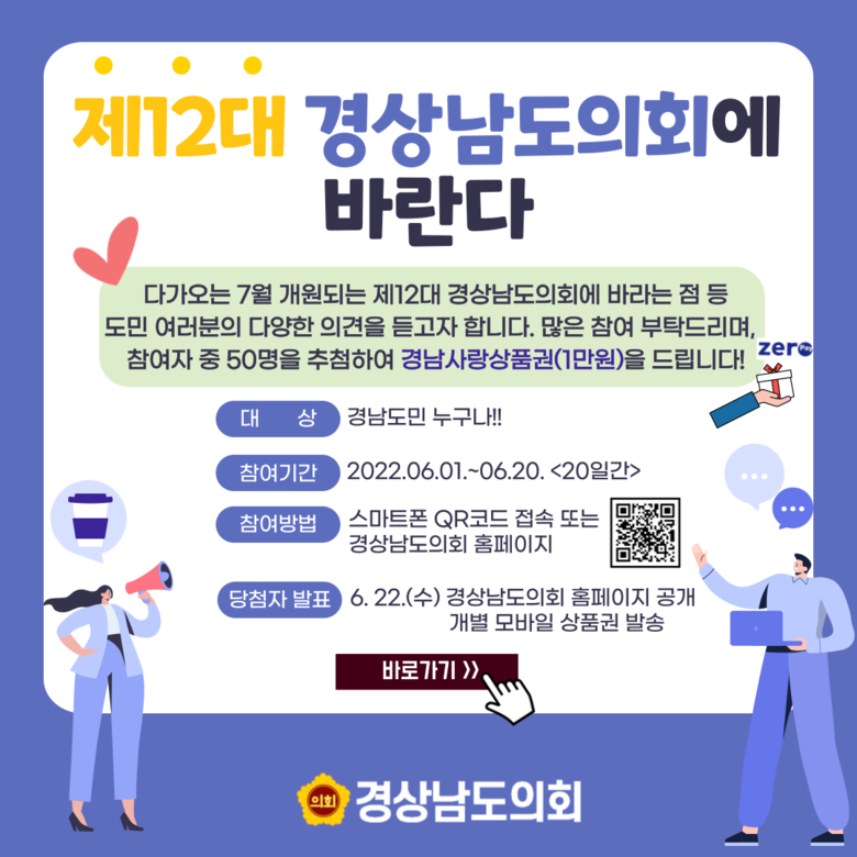 이번 ‘제12대 경상남도의회에 바란다’ 도민 인식조사는 도의회 개원 이후 처음으로 실시되는 것으로 기간은 6월 1일부터 6월 20일까지이며, 도의회 누리집(홈페이지), 홍보 배너 내 QR코드 통하여 참여 가능하다.