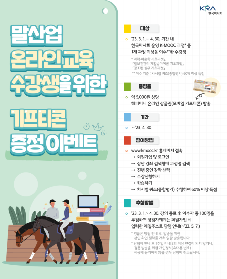 한국마사회는 온라인 교육 참여 활성화를 위해 수강생을 대상으로 상품권 증정 이벤트를 시행한다. 한국마사회는 3월 1일부터 4월 30일까지 이벤트 대상 강좌 중 1개 과정 이상 이수한 수강생을 대상으로 추첨을 통해 총 100명에게 문화상품권을 증정한다. 이벤트 대상강좌는 ▲마학·마술학 기초과정 ▲말보건관리·재활승마이론 기초과정 ▲말조련 실무 기초과정 총 3과목이다.