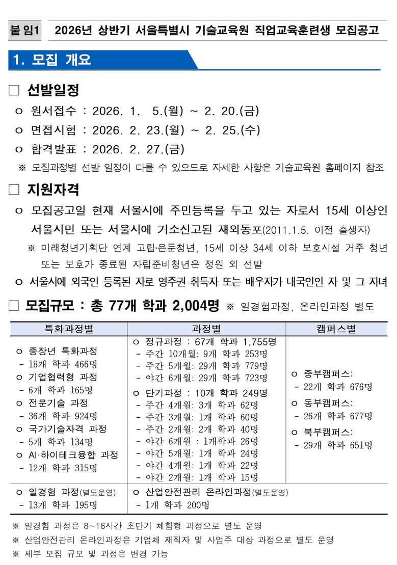 취업을 앞둔 청년과 재취업을 고민하는 중장년 모두에게 ‘대체되지 않는 기술’이 중요한 선택 기준으로 떠오르는 가운데, 서울시는 AI 시대에도 경쟁력을 갖춘 실무 기술인재를 양성하기 위해 2026년 상반기 서울시 기술교육원 훈련생 2,004명을 모집한다고 밝혔다.