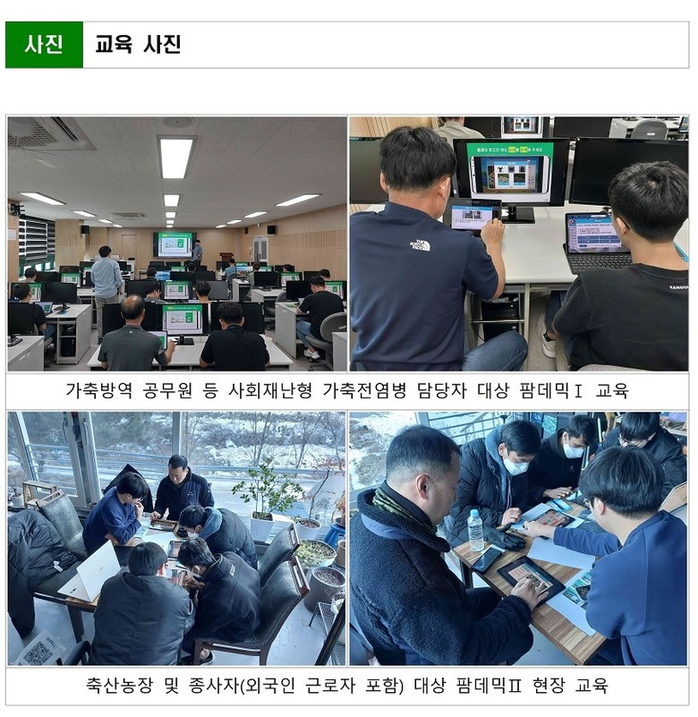 2025년에는 팜데믹 프로그램과 기자재를 구입해 총 8회 교육을 실시했으며, 191명의 공무원이 참여해 평균 만족도 89%를 기록했다. 참여형·체험형 교육 방식과 태블릿 활용으로 현장감과 몰입도를 높였고, 설문조사를 통한 지속적 개선으로 교육 효과를 강화했다.