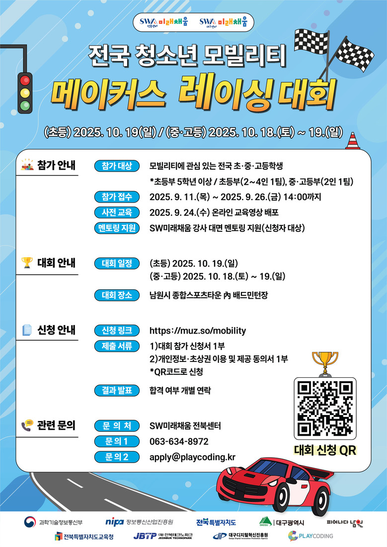 이번 대회는 과학기술정보통신부와 정보통신산업진흥원이 주최하고, SW미래채움 전북센터와 대구센터가 공동 주관하며, 전북특별자치도와 남원시, 전북특별자치도교육청 등이 후원하는 행사이다. 더불어 ‘2025 남원 국제드론제전 with 로봇’과 연계해 미래 모빌리티와 첨단 로봇 기술이 융합된 종합 기술 축제로 진행된다.