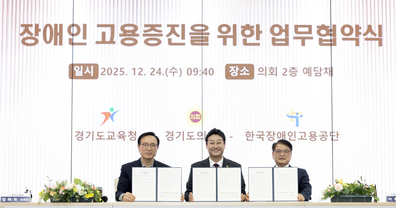 [경기도 세계타임즈=송민수 기자] 경기도교육청(교육감 임태희)이 24일 경기도의회 예담채에서 경기도의회(의장 김진경), 한국장애인고용공단(이사장 이종성)과 함께 장애인 고용증진을 위한 업무협약을 체결했다.