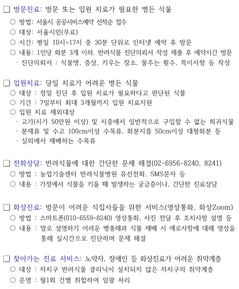 반려식물병원(서초구 서울시농업기술센터 내)은 병든 반려식물을 전문적으로 진단‧치료하고 사후관리 방법까지 알려주는 반려식물 전용 종합병원으로 진단·처방실과 입원치료실을 비롯해 시민 대상 재배 교육과 원예 실습이 가능한 공간을 갖추고 있다.